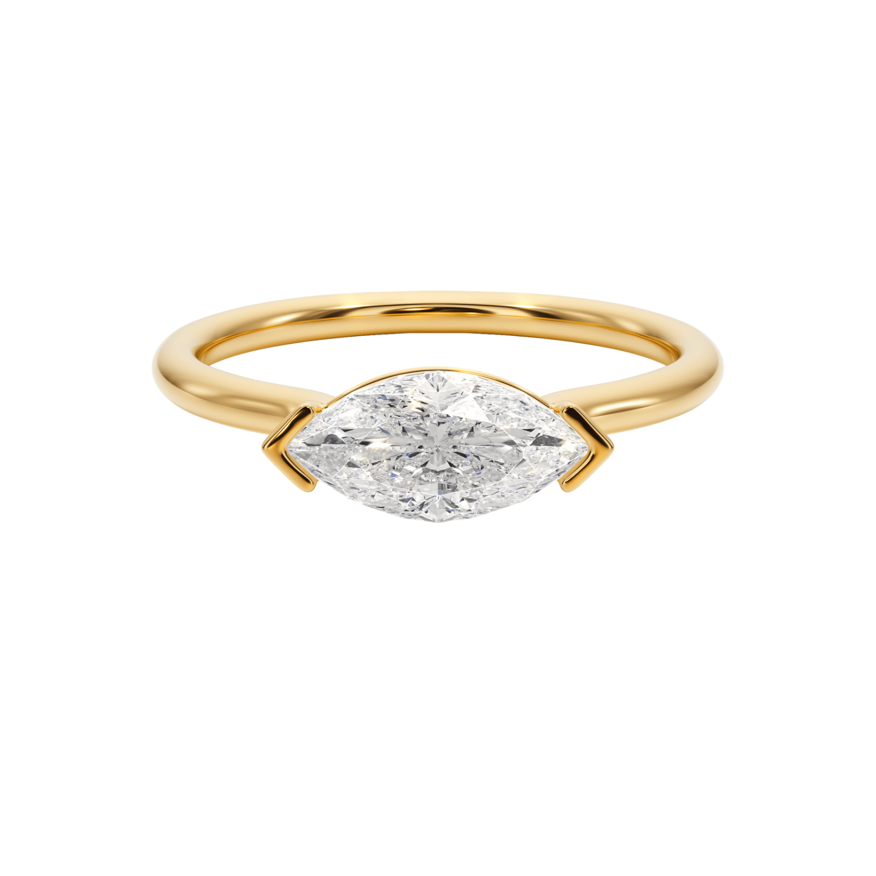 The Marquise Mirage East-West Engagement Ring features a striking marquise-cut diamond set horizontally in a refined half bezel setting. The east-west orientation modernizes the elongated marquise silhouette while preserving its timeless elegance.