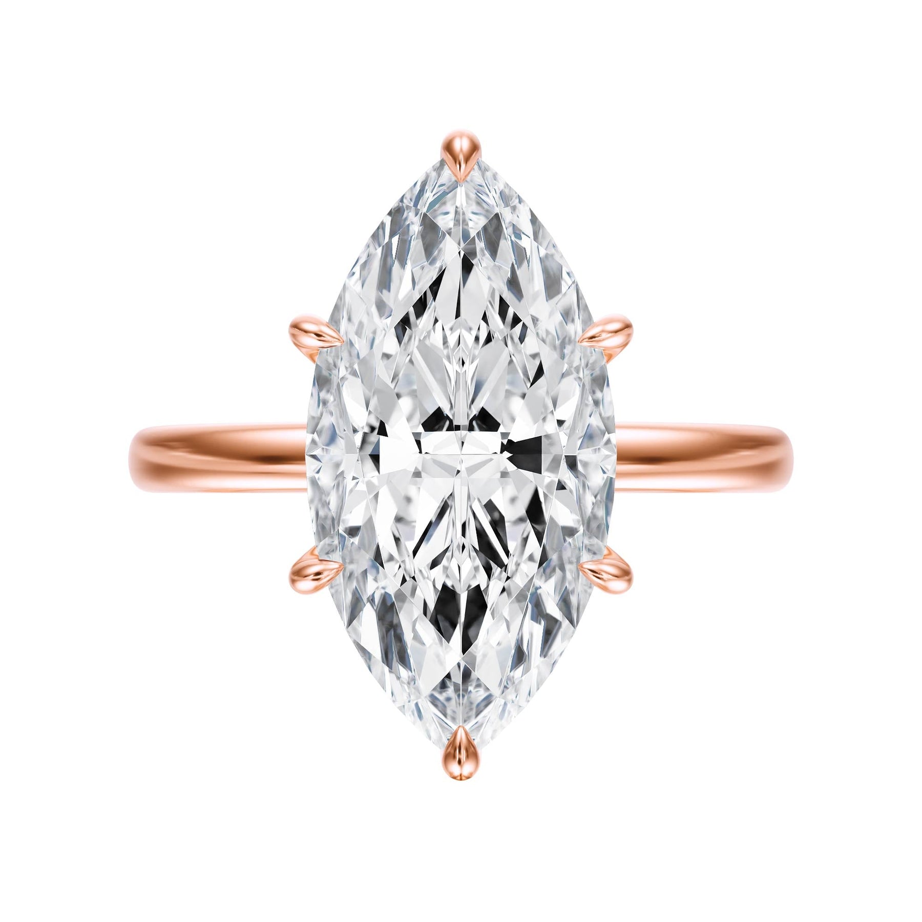 The Elara Hidden Halo Marquise Diamond Engagement Ring showcases a marquise-cut diamond in a sleek solitaire setting, complemented by a hidden halo beneath the center stone that enhances brilliance from below. The elongated shape creates a striking silhouette while the setting remains clean and modern.
